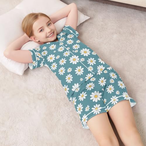 White Daisy Pattern Summer Satin Pajama Set, Cute Button-Down Sleepwear Pj Set for Sleep Wears 6