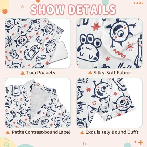 Cute Monster Prints Summer Satin Pajama Set, Cute Button-Down Sleepwear Pj Set for Sleep Wears 6