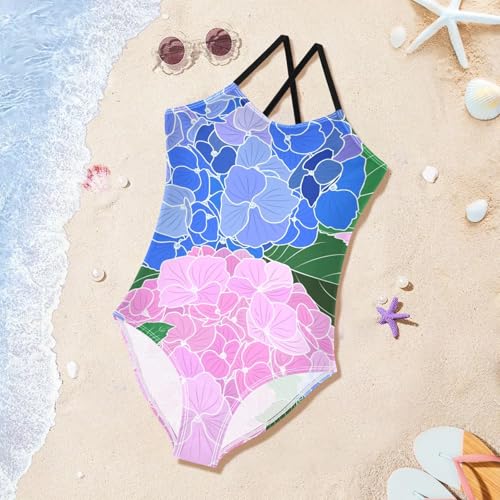 Girls One Piece Swimsuits Blooming Hydrangea Flowers Pattern Sport Halter Swimwear Beach Bathing Suit,9-10T 1