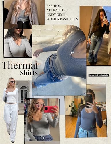 More information about Ekouaer Deep V Neck Shirts for Women Long Sleeve Thermal Tops Slim Fit Lightweight Undershirts Soft Low Cut Tees XS-XXL