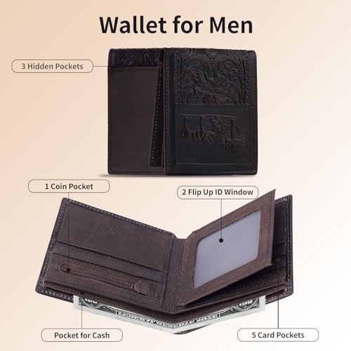 • MENS LEATHER WALLET: The cover of the western wallet is made of genuine leather, the pattern is pressed by machine and then discolored by hand. The cover is harder than ordinary leather and has an embossed design of the flower and praying, which is retro and unique. The stitching is even and smooth, wear-resistant, scratch-resistant, and more resistant to dirt.