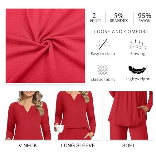 • Features and Functions: Cute 2 piece outfits, long sleeve tops, soft nightwear, elegant v-neck detailed design. Pajamas pants are very flowy, have nice deep pockets to hold a smart phone without it falling out. This pajama set provides an inclusive fit. Embrace the perfect balance of style and comfort with these women's pajamas, suitable for all body types