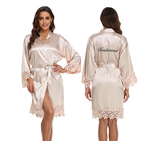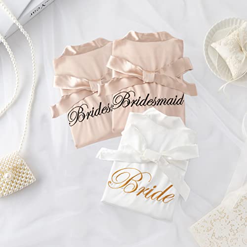 • Special design: The bride and bridesmaids robes set with 'Bride' and 'Bridesmaid' embroidered on the back, lettering in gold colour, delicate and dimensional, attached with a detachable girdle at the waist, can be adjusted to suit your waistline. The bridal and bridesmaids bathrobes are designed with lace trim on the sleeves and bottom for added charm and beauty