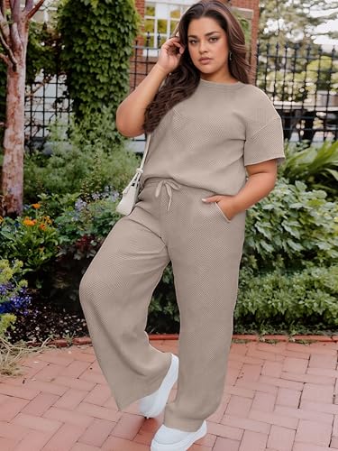 • Feature: Women's plus size 2 piece oufits, short sleeve, round neck, ribbed, adjustable elastic drawstring, two side pockets, high waisted wide leg pants and oversized loose fitting, create a relaxed and slouchy silhouette.