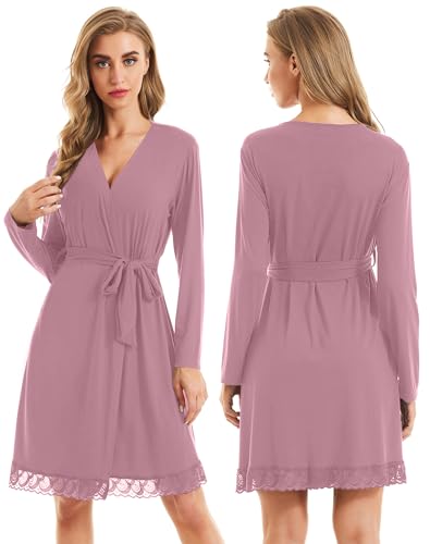 • ❀Novel Design: Womens bathrobe featuring a variety of popular elements -- long sleeve, solid color, belt, lace hem, v neckline design, inside ties. Inside ties keeps it from slipping open in addition to the outside belt. Lace hem and v neckline makes you more elegant and attractive. Perfect knee length sleep robes is convenient for women night sleepwear.