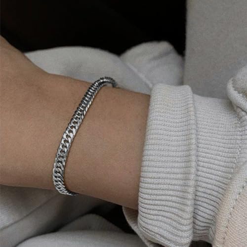 Dacc & Aya Fashion 925 Sterling Silver Flat Curb Cuban Link Chain Bracelet for Men Women, 3MM, 4MM, 7MM, Solid Silver Cuban Thick Big Link Chain Bracelet with Lobster Clasp, 7-9 Inch 4