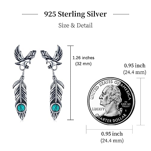 925 Sterling Silver Turquoise Feather Earrings Dangling America Western Eagle Feather Earrings Men Feather Jewelry Turquoise Western Style Gifts Hypoallergenic 4
