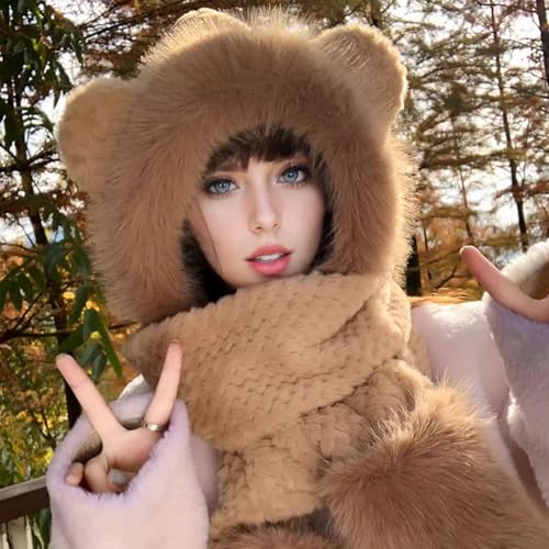 KAHHZA Hooded Scarf Hat Gloves for Women Winter Fur Bear Ears Hat 3 in 1 Plush Animal Hat with Mittens Furry Cute Warm 7