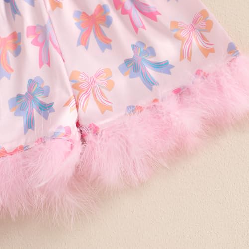 • DESIGN: Toddler 2 piece pajamas girls button down shirts and the short pants with elastic waistband. The bowknot print and feather trim adds a touch of whimsy and playfulness, girls summer pajamas, silk summer pajamas for kids girls, toddler satin pajamas, kids pajamas girls, girls satin shirt, feather pajamas kids, kids silk pajamas girls