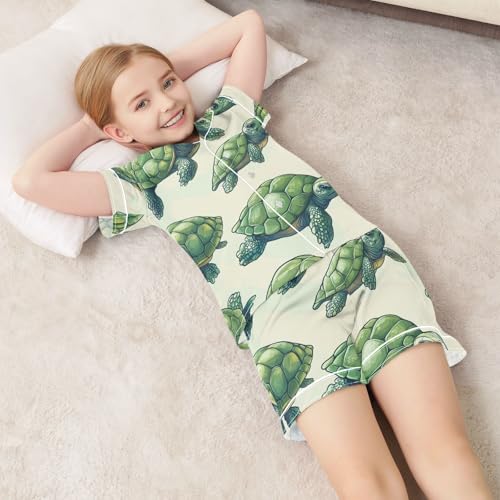 Satin Pajama Sets Short Sleeve Sea Green Turtle Pattern Button Down Silky Nightwear 2 Piece PJS 5-14Y 6