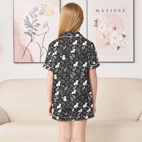 senya Flower Cat Black Satin Summer Pajama Sets Silk Short Sleeve Button Down Sleepwear 6