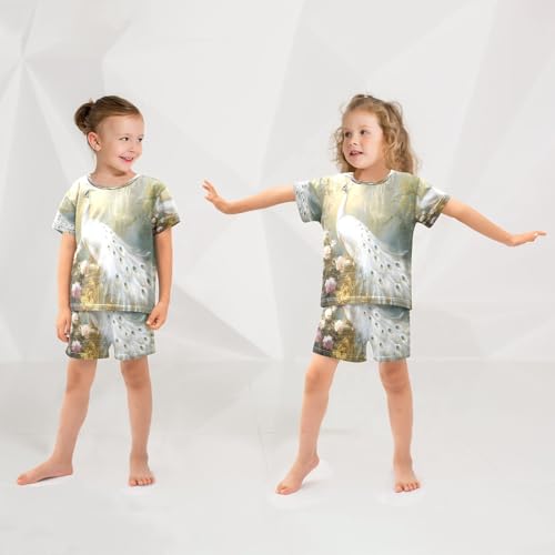 ALAZA White Peacock Peony Blossom Pajamas Set Short Sleeve Cotton Sleepwear Summer Pjs 2 Piece 5-14Y 2