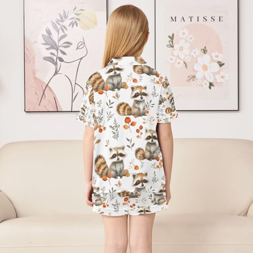 senya Raccoon Autumn Leaves Satin Summer Pajama Sets Silk Short Sleeve Button Down Sleepwear 1
