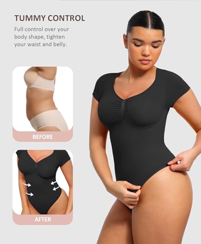 HOT ! FeelinGirl Short Sleeve Bodysuit for Women V Neck Tummy Control Shapewear Seamless Thong Body Suits Tops
