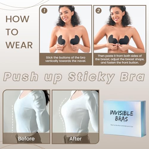 • Adhesive bra waterproof easy to clean and reusable: Wipe your breasts with a warm towel before using sticky bra. Sweat and high temperature may affect the silicone sticky push up bras for women. Hand wash with running water after each use of bra for backless dresses, very easy to clean in just a few minutes. dry adhesive bra in a cool place. Adhesive push up bra exposure may also reduce tack, each sticky boobspush up bra can be used multiple times with good adhesion if cared for properly.