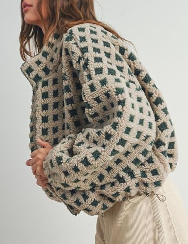• Cropped teddy checkered coat for women, relaxed fit, drop shoulder, lapel collar, zip front closure, special elastic cuffs and hem design, bottom edge with adjustable drawstring for loose hem, vibrant youthful color scheme for women