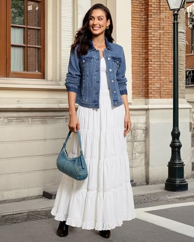 • Soft denim jacket women boasts a premium denim texture fabric that embodies both durability and softness, keeps you all-day comfort in spring, autumn and winter. Expertly tailored from rich textured jacquard fabric, blending stylish and modern casual style