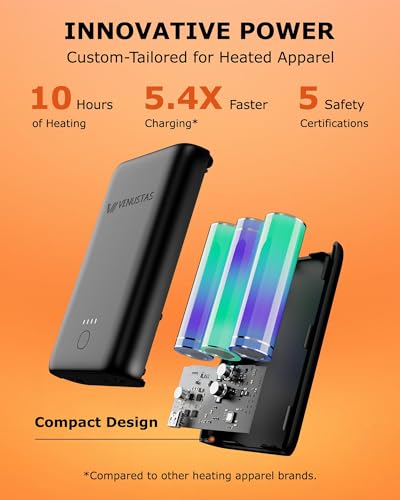 • 2-Hour Quick Charge & 10-Hour Warmth: Fully charge in just 2 hours and enjoy up to 10 hours of adjustable heat with 3 heating levels (140°F high, 131°F medium, 108°F low). Venustas heated softshell jacket has NTC thermal protection for safe, worry-free warmth, while the built-in power bank keeps your devices charged on the go.