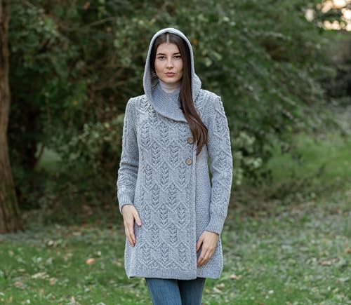 SAOL 100% Merino Wool Women Cardigan Butonned with Hood Aran Leaf Coat Made in Ireland 5