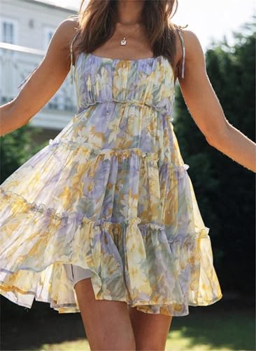 AELSON Sundresses for Women 2025 Floral Summer Dress Boho Flowy Cute Dresses Spaghetti Strap Sleeveless Ruffle Mini Dress 7