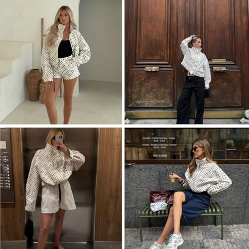 Xunger Women’s Polka Dot Jacket High Neck Long Sleeve Drawstring Hem Casual Trendy Cropped Coat with Pockets 1