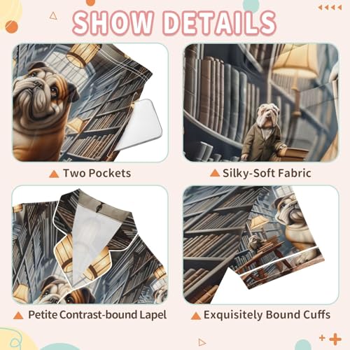 ALAZA Bulldog Bookshelf Library Bookworm Satin Pajamas Set Short Sleeve Button Down Sleepwear Summer Pjs 2 Piece 7
