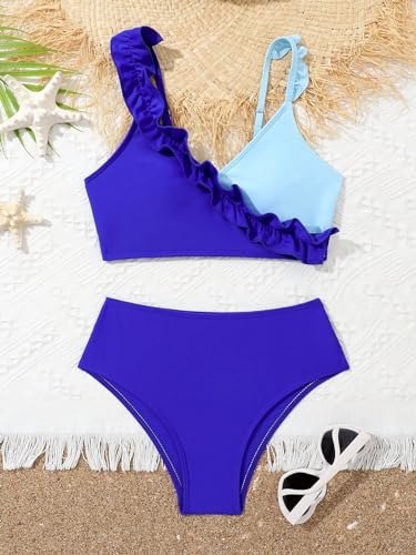 WDIRARA Girl's 2 Piece Colorblock Ruffle Hem Swimwear Set Frill Trim Swimsuit Set Summer Bathing Suit 2