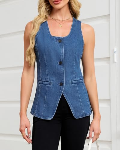 Kedera Denim Vest for Women Button Down Long Jean Waistcoat Casual Scoop Neck Sleeveless Denim Jackets Slim Fit Jean Top 5