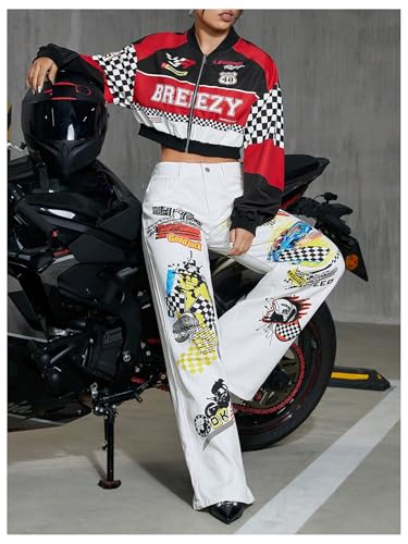 HOT ! GORGLITTER Women's Racing Jacket Zip Up Cropped Varsity Jacket Color Block Letter Graphic Motorcycle Biker Coats