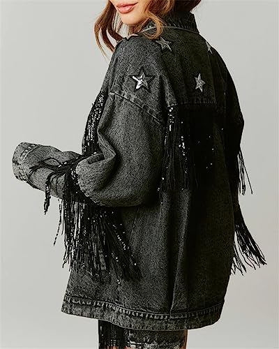 Women's Boyfriend Denim Jacket Long Sleeve Oversized Fringe Jean Jacket Coats 4