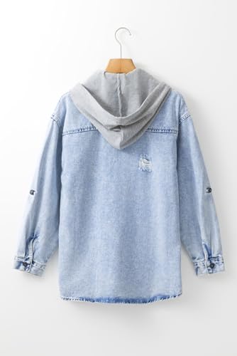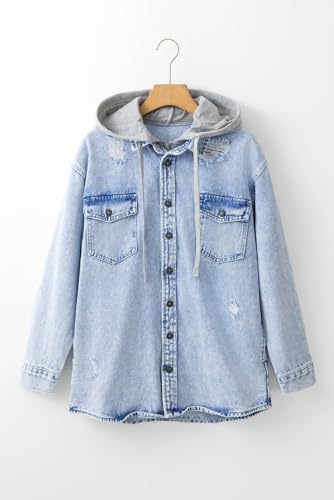 Ecosunny Womens Casual Long Sleeve Button Down Shirt Jacket Oversized Contrast Hooded Denim Lightweight Coat Tops 6