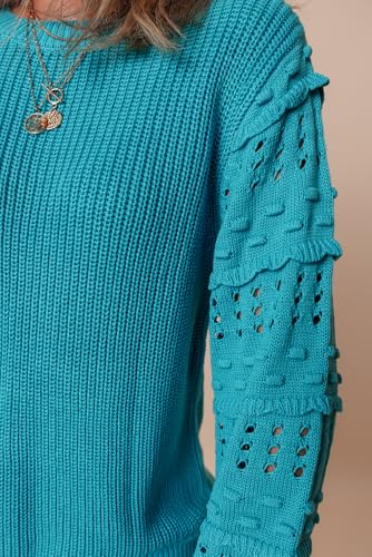 • 1. **Effortless Elegance**: Elevate your style with this stunning turquoise sweater featuring ruffled eyelet bubble sleeves and a round neck. Perfect for both dressy and casual occasions, this knit top is sure to turn heads.