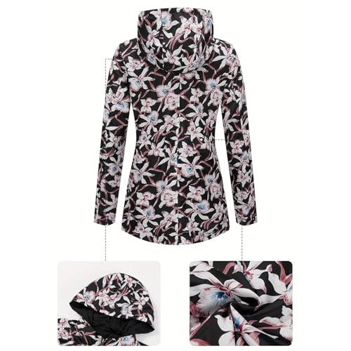 Reversible Rain Jacket Women Lightweight Waterproof Outdoor Raincoat Floral Print Hooded Casual Windbreaker Outerwear 1