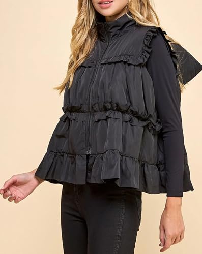 Womens Ruffle Puffer Vest Winter Warm Zip Up Stand Collar Back Bow Padded Gilet with Pockets 1