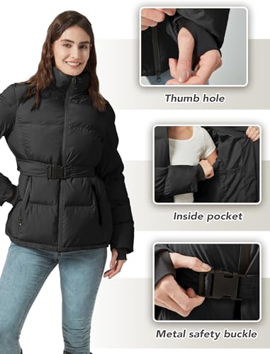 Women's Winter Warm Puffer Jackets Slim Fit Water-Resistant Detachable Hooded with Belt 4