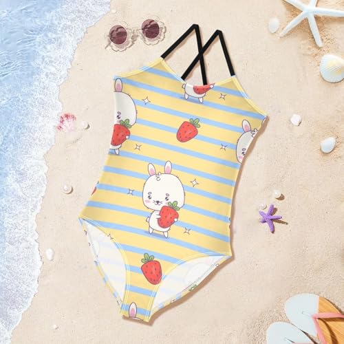 Girls One Piece Swimsuits Bunny with Strawberries Pattern Sport Halter Swimwear Beach Bathing Suit, 4T 6