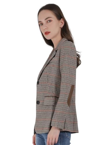 Women's Fashion Notched Lapel Wool Plaid Blazer Slim Long Sleeve Jacket with Elbow Patch 6