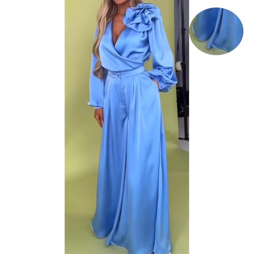Women's two-piece suit, satin 3D flower V-neck long-sleeved top wide-leg pants suit, sexy, elegant solid color satin 2