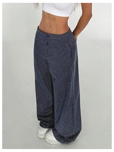 HOT ! MakeMeChic Women's Striped Wide Leg Dressy Pants Low Waist Button Business Trousers