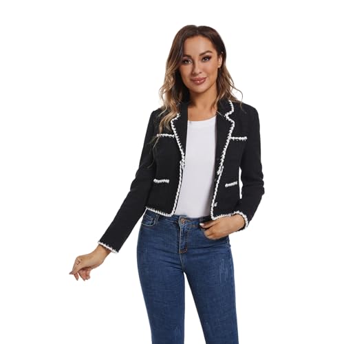 • FEATURES- This cropped lightweight tweed blazer jacket comes in a classic black and white color scheme with elegant pearl buttons, which gives it a timeless and elegant appeal. The fitted silhouette is designed to accentuate the wearer's proportions, This garment offers a stylish yet effortless look, perfect for those who want to make a statement without having to put in too much effort.