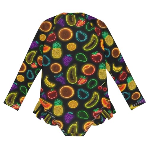 ALAZA Funny Fruit Cherry Lemon Neon Girls One Piece Swimsuit Long Sleeve Rash Guard Swimsuits UV 50+ Swimwear Zipper 1