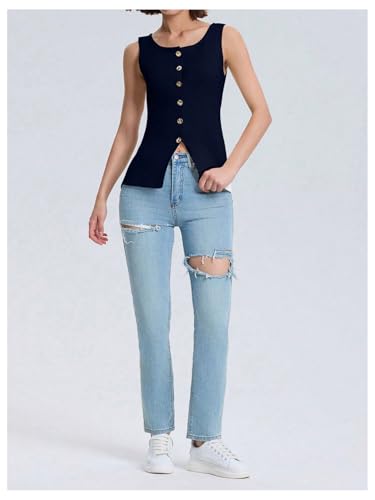 HOT ! Verdusa Women's Button Front Blazer Rib Knitted Vest Scoop Neck Slit Sleeveless Top